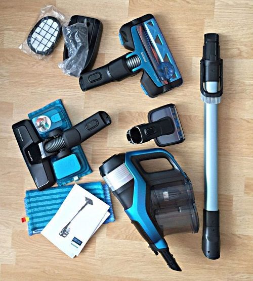 Krabica, v ktorej som si ho priniesla domov vyzerala naozaj pútavo, s veľkou fotografiou naozaj krásneho bezdrôtového tyčového modro strieborného vysávača 3 v 1. Po jej otvorení som našla súčasti ako – jednotku motora a nádobku na prach a nečistoty, trubice, saciu kefu, nasávacie a čistiace zariadenie, LED nasávacie zariadenie, utierky z mikrovlákna v počte 2, závesný systém,