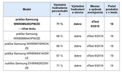 Časopis dTest vo svojom septembrovom čísle podrobil redakčnému a laboratórnemu testovaniu práčky a sušičky. Do kategórie práčok bol zaradený aj model Samsung QuickDrive WW90M649OPM/ZE, ktorý obstál v konkurencii 17 ďalších modelov. V celkovom percentuálnom hodnotení dosiahol 71 % (dobre) a získal značku kvality Víťaz testu.