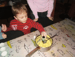 Do teplej vody vmiešame med, farbivo a maslo. Potom vmiešame nastrúhané mydlo na jemno. Miešame nad parou do hustoty veľmi hustého pudingu. Pri varení prechádza masa niekoľkými fázami, najprv je veľmi hustá, postupne redne – topí sa mydlo, potom začne hustnúť ako keď varíme lekvár. Vtedy vmiešame citrónovú šťavu a citrónovú arómu. A rozdelíme do košíčkov na pečenie. Necháme stvrdnúť asi hodinu.