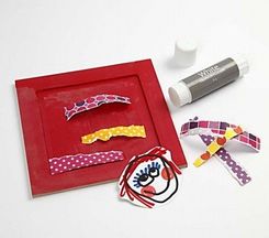 - Papier potrháme a prilepíme do vnútra rámika. Vystrihneme rôzne kúsky z detskej kresby, ktoré chceme použiť a taktiež prilepíme na rámik.