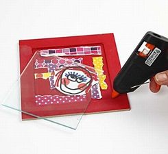 - Rámik zasklíme. Aby sklo pevne držalo prilepíme ho lepiacou pištoľou.
