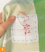 1. Jemnú vyšívaciu tkaninu pristehujeme na základnú tkaninu. Stred tkaniny označíme niťou na šitie. To nám pomôže pri vyratúvaní vzoru.