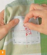 2. Ďalší rad začíname na lícnej strane tkaniny krycím stehom. Odrátame tri nite nadol a tri doprava a potom vpichneme. Potom odrátame tri nite nahor a pichneme do lícnej strany jemnej vyšívacej tkaniny. Takto vyšijeme celý rad.