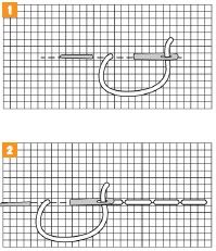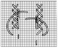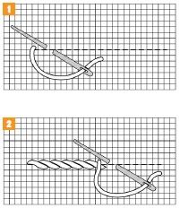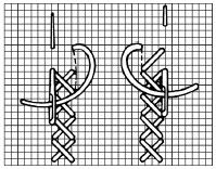 1 – 2. Tento párový steh pozostáva z dvoch v protichodnom smere priečnych plochých stehov. Zhotovuje sa tak, že urobíme jeden priečny plochý steh. Na rubovej strane tkaniny v jednej línii so začiatkom prvého stehu, ale vo vzdialenosti jedného stehu pichneme nahor a tento steh dokončíme v rovnakom bode, kde sme pichli nadol predchádzajúci steh.