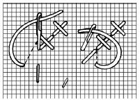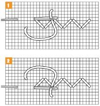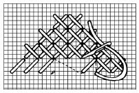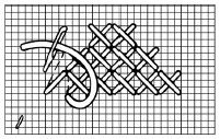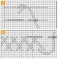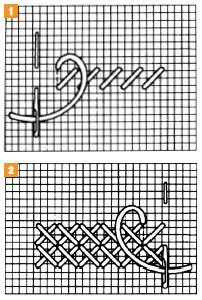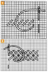 1. Technika sa podobá na jednoduchý krížikový steh. Prvý steh je jednoduchý krížik, kde vpichneme do jeho začiatočného bodu. Potom vpichneme ihlu nadol priečne doprava v dĺžke dvoch stehov (dvoch štvorčekov). Tento dlhý priečny steh prichytíme jedným krížikovým stehom už známym spôsobom. Takto pokračujeme v celom rade vyšívania. Keď sa dostaneme na ko-niec radu, otočíme sa a namiesto dlhého krížikového stehu pokračujeme krátkym stehom. Otočíme prácu a začneme ďalší rad vyšívania, ale tu sú oba stehy rovnakej dĺžky. Od vyznačeného stredu začíname doprava a dole šikmým plochým stehom. Vodorovne opäť vpichneme doľava v polovici medzi vodorovne meranou vzdialenosťou vyznačeného začiatku a pri bode vpichu začiatočného plochého stehu.