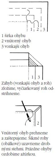 Najprv vytiahneme po jednej niti tkaniny na všetkých štyroch stranách od rohu po roh k línii prázdneho ohybu. Pri strede vytiahnutých nitiek bude roh ohybu. Zostávajúcu látku odstrihneme po trojnásobnej dĺžke ohnutia (presahujúcej látku). Pri látkach štvorcového tvaru má byť ohyb rovnako vzdialený od výšivky na všetkých štyroch stranách. Ohyb zhotovujeme vždy zľava doprava tupou vyšívacou ihlou.