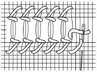 1. Keď musíme pri vyšívaní postupovať zhora nadol, začíname prvý rad na ľavej strane a pokračujeme ďalej, postupujúc doprava. Vychádzame z ľavého dolného radu. Ihlu vpichneme zospodu do tkaniny, odrátame tri nite doprava a tri nite nahor a vpichneme ihlu. Na rubovej strane odrátame tri nite nadol a vpichneme späť na lícnej strane jemnej vyšívacej tkaniny. Pokračujeme do požadovanej dĺžky.