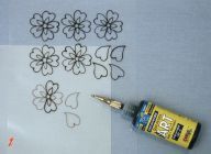 Lupene namaľujeme kontúrou i bez kontúry, po zaschnutí ich nanesieme v tvare srdca na daný povrch. Jeden kvet bez kontúry priložíme lupeň po lupeni do ľavého dolného rohu. Medzery ozdobíme bodkami nanesenými priamo na povrch.