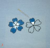 Jednotlivé kvety nakreslíme na fóliu čiernou kontúrou, po uschnutí vymaľujeme jednotlivé plochy. Do stredu kvetu nanesieme bielu farbu, potom zvnútra ťaháme čiary z bielej farby smerom do modrej. Stopky kvetov kreslíme čiernou kontúrou priamo na sklený povrch. Jednotlivé časti vyplníme kráľovskou modrou farbou.