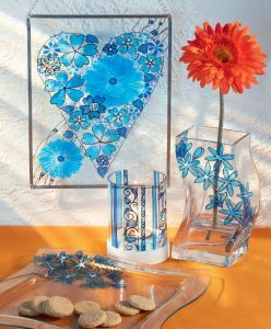 Ozdobné línie (asi 3 mm široké) zhotovíme na fóliu (pozri s. 4). Najprv nakreslíme ozdobné motívy, po zaschnutí nanesieme modré farby. Keď modré plochy uschnú, ostatné medzery vyplníme priesvitnou farbou. Necháme opäť uschnúť, potom motív opatrne stiahneme a priložíme na miesto. Prebytočnú časť odstrihneme. Drevenú spodnú časť svietnika namaľujeme bielou akrylovou farbou.