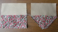 K jednej strane prišijeme pás 10 x 30 cm a tým nám vznikla predná časť vrecka. Zadnú časť spravíme z béžovej látky. Tri strany zošijeme, vrch zahneme, zviažeme mašľou a vrecko je hotové.