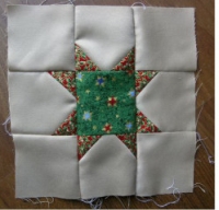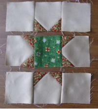 Zošívame dvojice štvorcov, ukladáme ich do pásov, napokon zošijeme všetky pásy.