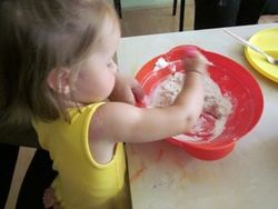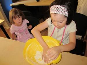 Prisypali sme si trochu hladkej pšeničnej múky a miešali – rukami. TO BOLA ZÁBAVA. Urobili sme taký hustý puding. Potom sme si zobrali dvakrát medzi prsty soli a vmiešali soľ. A zase sme vmiešali hladkú pšeničnú múku až kým sme nedostali takú veľkú guľu ako tenisová loptička. Položili sme ju na papier na pečenie. Na teplom mieste muselo cesto kysnúť, kým sme si všetci poriadne neumyli ruky – čo trvalo asi trištvrte hodinu.