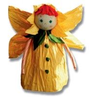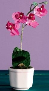 Púčiky sú vytvorené z papiera v tvare guľky, zabaleného do zeleného papiera. Hotový kvet zapichneme do črepníka vystlaného plastelínou, ktorú prekryjeme machom.