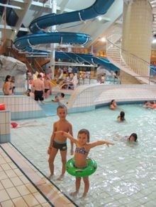 Ale čo nás všetkých očarilo najviac bol „termálny vodný svet s rôznymi bazénikmi pre najmenšie deti s hĺbkou od 10 cm až po športový plavecký bazén, šmýkľavky, tobogány, bazén so simuláciou vĺn….Sonnentherme – bazény s termálnou čistou vodou, v ktorej sa hrali rodičia spolu so svojimi deťmi, boli prepojené chodbou priamo z hotela, kde sme bývali. Tak sme sa ľahko celá rodinka prezliekli do plaviek ešte na izbe a v županoch sme sa „v pohodke“ výťahom doviezli k chodbe, ktorá viedla priamo k bazénom a šup! rovno do vody.