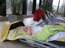 Dopackali, donatierali, dočlapkali sme sa. V sprchách si sadám na sprchovaciu stoličku s babetkom na kolenách, a bez problémov sa spolu osprchujeme. Úžasný výmysel. V šatni nechýba niekoľko prebaľovacích pultov. Začínam mať pocit, že Slovensko prestalo byť zakliatou krajinou, kde sa hosť – rodina s malými deťmi neberie vážne.
