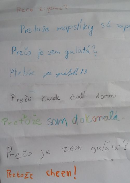 Každý si vymyslí jednu otázku, ktorá sa začína slovom „Prečo“ (Prečo je dnes sobota? Prečo je slnko horúce? … niekedy musíte deti trochu povzbudiť a dať im zopár príkladov). Otázku každý napíše na papier a ten následne pod otázkou zahne tak, aby otázku nebolo vidno.