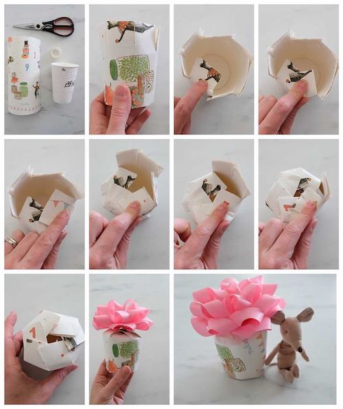 Odstrihnite hornú zaoblenú časť papierového pohárika a vonkajšiu časť oblepte podľa vášho vkusu – môžete použiť nálepky, dekoratívny alebo baliaci papier. Ak použijete papier, spodnú časť poriadne zalepte, aby sa papier neodlúpol. Následne zastrihnite nožnicami cca 3 cm hrubé a dlhé pásiky na vrchnej časti pohára po okrajoch. Naplňte pohárik malým prekvapením a pásy zatlačte smerom dovnútra. Stačí pridať mašľu a máte neobyčajne a zároveň zrecyklovane zabalený darček.