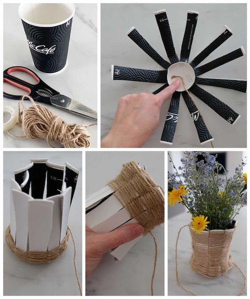 Aj z prázdneho papierového pohárika viete vyčarovať s vašimi ratolesťami zaujímavý doplnok do bytu. Rozstrihajte bočné časti pohárika na 7 pásikov. Dno pohárika nechajte v pôvodnom stave. Nastrihaný pohárik rozprestrite na rovnú plochu a ovíjajte striedavo cez pásiky prírodný špagát. Postupne si tak vybudujete pevné steny závesnej vázy. Keď už budete mat obmotaný celý pohárik, na dvoch stranách upevnite závesné lanko. Čo zasadíte dovnútra je už na vás, skvelo poslúži na sušené kytice alebo malé ľahké lúčne kvietky.