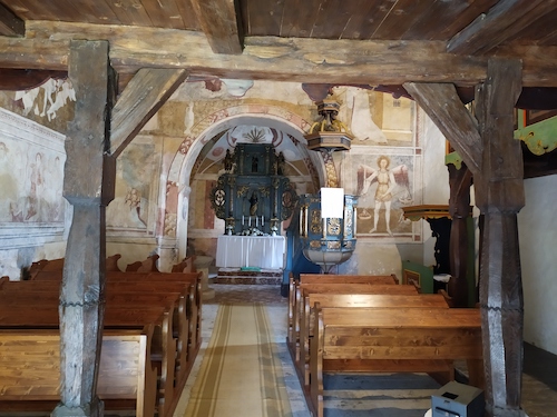 Vnútro kostola má steny zaplnené farebnými, unikátne zachovanými gotickými freskami. Farebne stvárnený je aj drevený kazetový strop a chór, bohato vyrezávaný renesančný oltár a kazateľnica ako aj malý a vraj stále funkčný organ. Zrazu neviete, kam skôr pozrieť. A v celej tej bohatej nádhere nenápadne stojí ešte jeden vzácny kus – kamenná stredoveká krstiteľnica z 13. storočia.
