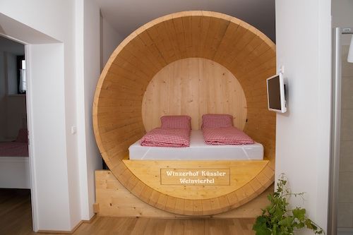 5) Weingut Küssler – Spánok v originálnom vínnom sude môžete zažiť v prevádzke Weingut Küssler. Deväťtisíclitrové sudy ponúkajú dostatok miesta pre unavených dovolenkárov hľadajúcich trochu oddychu. Ubytovanie sa nachádza v príjemnom prostredí rozsiahleho vinárstva. K dispozícii budete mať miestne vínne špeciality a výber vína z 300-ročnej pivnice. Môžete sa túlať blízkymi vínnymi uličkami či sa len jednoducho opaľovať v prírode.