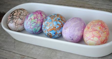Nalejte laky do vody a hrajte sa s farbami. Špáradlom zmiešajte farby. Vajíčko (uvarené) chyťte medzi prsty tak, aby prsty zaberali čo najmenšiu plochu na vajíčku. Ponorte vajce na niekoľko sekúnd do vody a vyberte ho. Položte vajíčko na kartón alebo sieťku, aby uschlo.