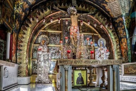Strmými schodíkmi sa dá dostať na najvyššie miesto chrámu, na vrchol samotnej Golgoty, kde je pod prezdobeným gréckym oltárom odhalená skala, v ktorej mal stáť skutočný Kristov kríž. Predstavuje miesto, kde Ježiš dokonal.
