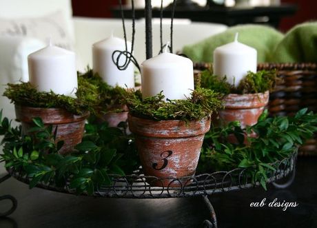 Postačia vám malé hlinené kvetináče, hoci aj staré, trocha niečoho zeleného, machu či krušpánu a sviečky. Kvetináče so sviečkami môžete umiestniť na kruhový podstavec, či na tácku vedľa seba a podľa svojej vôle ešte dozdobiť.