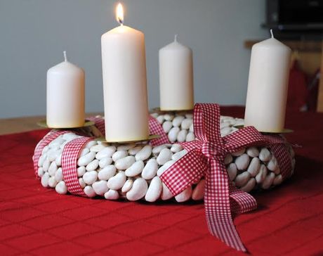 Začať môžete na obyčajnom vencovom základe a tavnou pištoľou naň pripevňovať bielu fazuľu a bodce na sviečky.