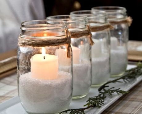 „Veniec“ môžete urobiť aj tak, že na nejakú vkusnú tácku položíte ľahko ozdobené zaváraninové poháre. Na ozdobu stačí kúsok lyka alebo vhodná stuha. Do pohárov nasypte soľ alebo farebný piesok, do toho potom postavte sviečku.