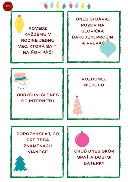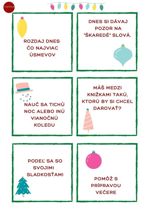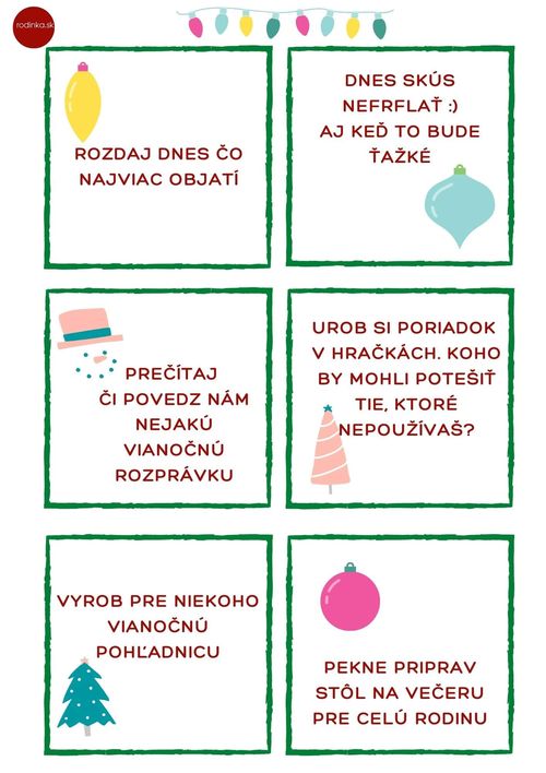Keď rozmýšľate nad nejakými inšpiráciami, potom hoďte očkom na tieto „kartičky“ s úlohami – je ich viac ako 24 na každý deň do Vianoc a určite si niečo pekné vyskladáte.