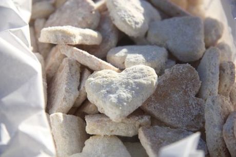 Opakujeme postup ako pri vanilkových rožkoch, ibaže si zmyslíme, že chceme srdiečka, a tak cesto vyvaľkáme asi na pol cm hrúbku a vykrajujeme z neho srdiečka alebo iné tvary.