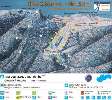 Novovybudované, komplexne vybavené lyžiarske stredisko SKI ZÁBAVA Hruštín leží v nadmorskej výške – od 900 m n. m. do 1150 m n. m. na severnej strane Oravskej Magury, 7 km za obcou Hruštín.