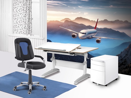 Môžete si vybrať farebné prevedenie stolov (kostry aj dosky) a čalúnenie stoličiek. Vhodné i do menších priestorov – šírka stolovej dosky len 90 cm. V základnej cene je vyklápacia pracovná plocha a veľký výsuvný organizér.