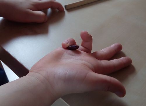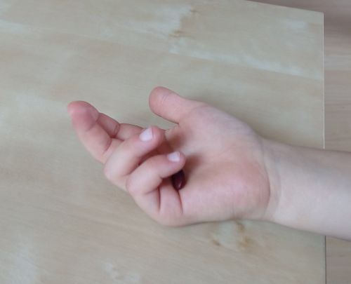 Dieťa otvorí ruku dlaňou hore. Vložíme mu na dlaň fazuľku a vyzveme ho, aby ju zachytilo malíčkom a prsteníkom.