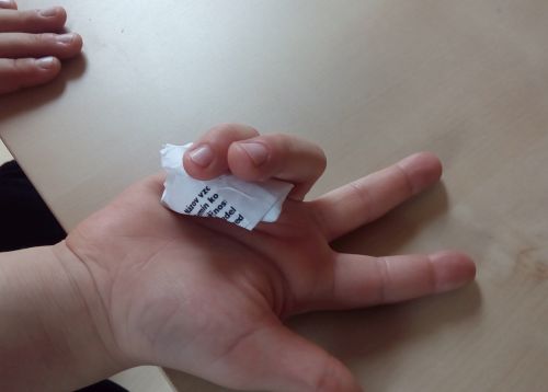 Vezmite malý kúsok postláčaného papiera a dajte ho dieťaťu chytiť pod prstenník a malíček. Zatiaľ čo dieťa stále drží vreckovku v týchto dvoch prstoch, do zvyšných troch prstov sa snaží uchopiť ceruzku.