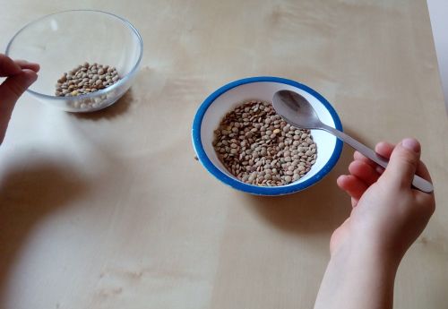 Úchop tromi prstami využívaný pri písaní je rovnaký ako úchop lyžice. Pripravte si dve misky, čajovú lyžičku a šošovicu, či iný drobný materiál. Úlohou dieťa je presypať pomocou lyžice obsah z jednej misky do druhej.
