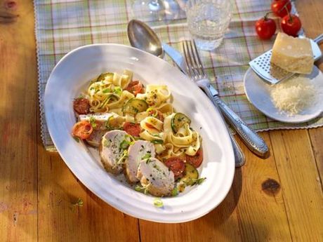 Pridáme uvarené cestoviny a jemne premiešame. Kuracie mäso krátko opečieme na panvici a potom pečieme ešte 12 minút v rúre predhriatej na 180 stupňov. Keď je mäso upečené, opatrne ho nakrájame a podávame s pripravenými cestovinami a zeleninou.
