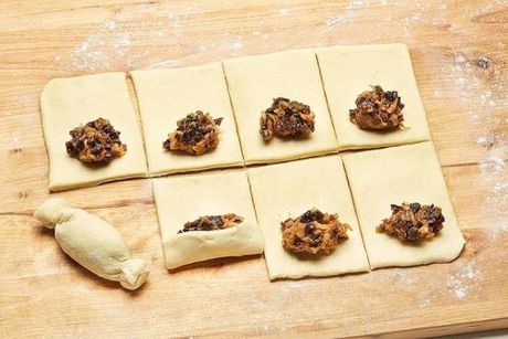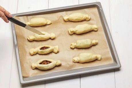 - Vykysnuté cesto na pomúčenej pracovnej ploche rozdelíme na polovice. Z každej vyvaľkáme plát asi 20 x 30 cm a rozkrájame na 8 obdĺžnikov. Náplň nanesieme na polovicu obdĺžnikov tak, aby zostal voľný okraj široký asi 1 cm. Zrolujeme, konce pritlačíme k sebe a položíme na plech vyložený papierom na pečenie spojom nadol. Povrch taštičiek uprostred nakrojíme ostrým nožom a trošku roztvoríme. Vložíme do predhriatej rúry a pečieme.