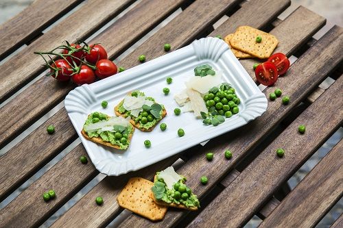 Všetky ingrediencie spolu rozmixujeme, natrieme na krekery s paradajkami, ozdobíme hoblinkami talianskeho parmezánu, guľôčkami hrášku a hráškovými výhonkami.