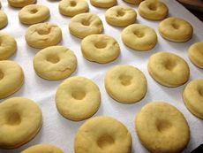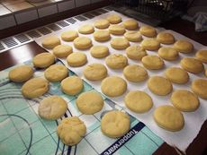 - Po vykysnutí rozvaľkajte na plát o hrúbke asi 1 cm a pohárom vykrajujte kolieska. Ukladajte bokom, na utierku. Vykrojené kolieska nechajte ešte „podkysnúť“, asi ½ hodinu.