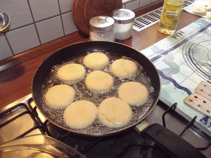 - Na panvicu nalejte olej, oleja musí byť pomerne veľa, šišky by v ňom mali plávať. Keď je olej dobre rozohriaty, znížte plameň (alebo stupeň), šišky sa smažia rýchlo, tak aby vám nezhoreli. Vysmážajú sa najprv dierkou nadol.