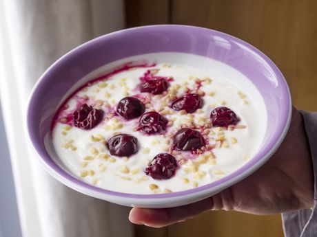 Kuskus podávame poliaty karamelom s vykôstkovanými a nasekanými čerstvými čerešňami.