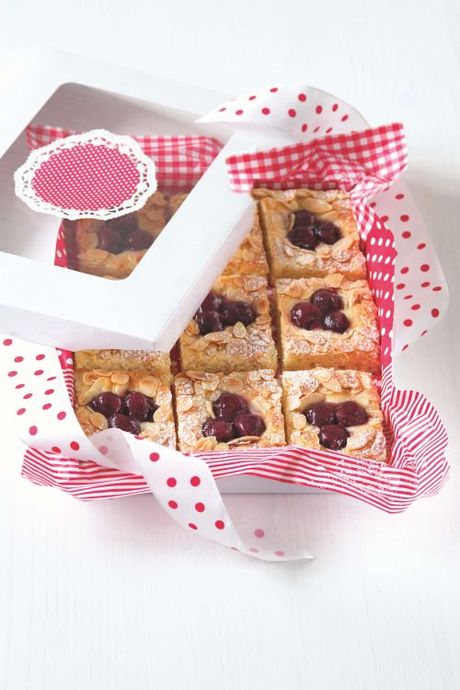 3. Na cesto poukladáme kôpky višní. Voľné cesto pokvapkáme rozpusteným maslom a posypeme plátkami mandlí. Vložíme do predhriatej rúry a pečieme.