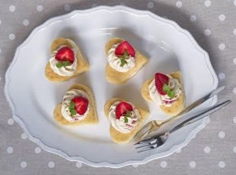 Štyri jahody nakrájame na veľmi malé kúsky a ručne vmiešame do zvyšnej náplne. Náplň dáme do cukrárskeho vrecka so širokou trubičkou (aby prešiel krém s jahodami) a srdiečkové sendviče náplňou ozdobíme. Dve jahody, ktoré sme si ponechali bokom na ozdobu, nakrájame na plátky a ozdobíme nimi sendviče. Uchovávame v chlade.