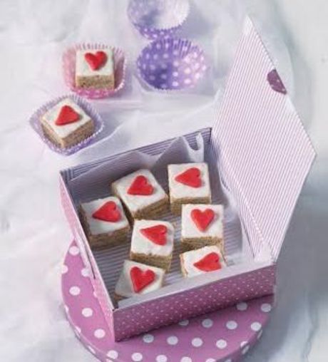 Marcipán zafarbíme gélovou farbou. Pomocou váľka rozvaľkáme marcipán na pracovnej ploche vysypanej práškovým cukrom a formičkou vykrajujeme srdiečka, ktorými zdobíme povrch kociek.