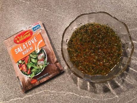 Zo zmesi korenín Šalátové korenie od Vitany som si podľa návodu na obale pripravila jednoduchú zálievku – 1 lyžicu korenia som v miske zmiešala s 2 lyžicami olivového oleja, 2 lyžicami octu a 7 lyžicami vody a nechala som ju pár minút odstáť.