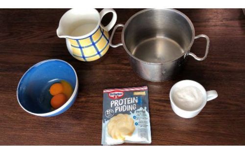 Vajíčka si rozdelíme na žĺtky a bielky. Mlieko nalejeme do hrnca, pridáme žĺtky, kryštálový cukor a Protein puding vanilka Dr.Oetker. Uvaríme hustý puding.