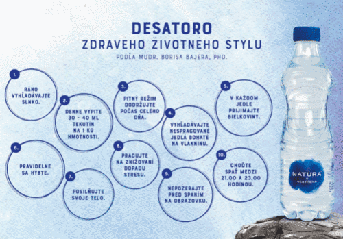 Všetci vieme, že piť treba, ale je len málo takých ľudí, ktorí naozaj prijímajú dosť tekutín. „Denne vypite 30 až 40 ml tekutín na kilogram hmotnosti. Objem prijatých tekutín prispôsobte svojej váhe a fyzickej aktivite. Prevažnú väčšinu by mala tvoriť čistá alebo pramenitá voda,“ radí doktor Bajer, ktorý tiež poznamenáva, že na Slovensku na správny pitný režim myslíme oveľa menej ako napríklad na vyhýbanie sa nezdravým jedlám.