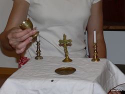 Na bočnom stolíku majú ešte miništranti odložené pomôcky – nájdeš tam ampulky, misku na vodu a tiež purifikatórium. Ampulky sú dve, môžu byť z kovu, brúseného skla alebo keramiky a v jednej je víno a v druhej voda. Vodou si kňaz umýva ruky po príprave obetných darov, voda tečie do misky a utiera si ich do tej bielej peknej vreckovky s ťažkým menom purifikatórium.
